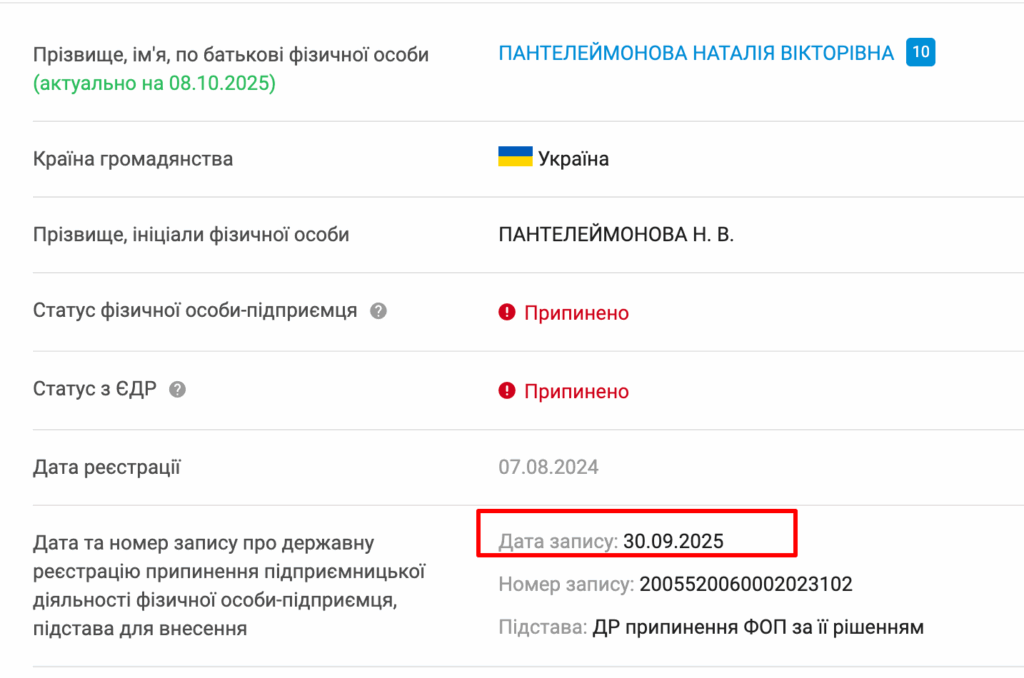 Цікаво, що пропрацювати підприємиця встигла трохи більше ніж рік. Зареєструвалася у серпні 2024 року, отримала підряд на вивезення сміття у жовтні 2024 року, потім отримала другий підряд у травні 2025 року і припинила свою діяльність у вересні.