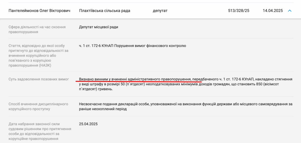 Підприємиця Наталія Пантелеймонова є колишньою дружиною депутата Плахтіївської сільради Олега Пантелеймонова. Пана Пантелеймонова у квітні поточного року покарали за несвоєчасне подання декларації штрафом у розмірі 850 гривень.