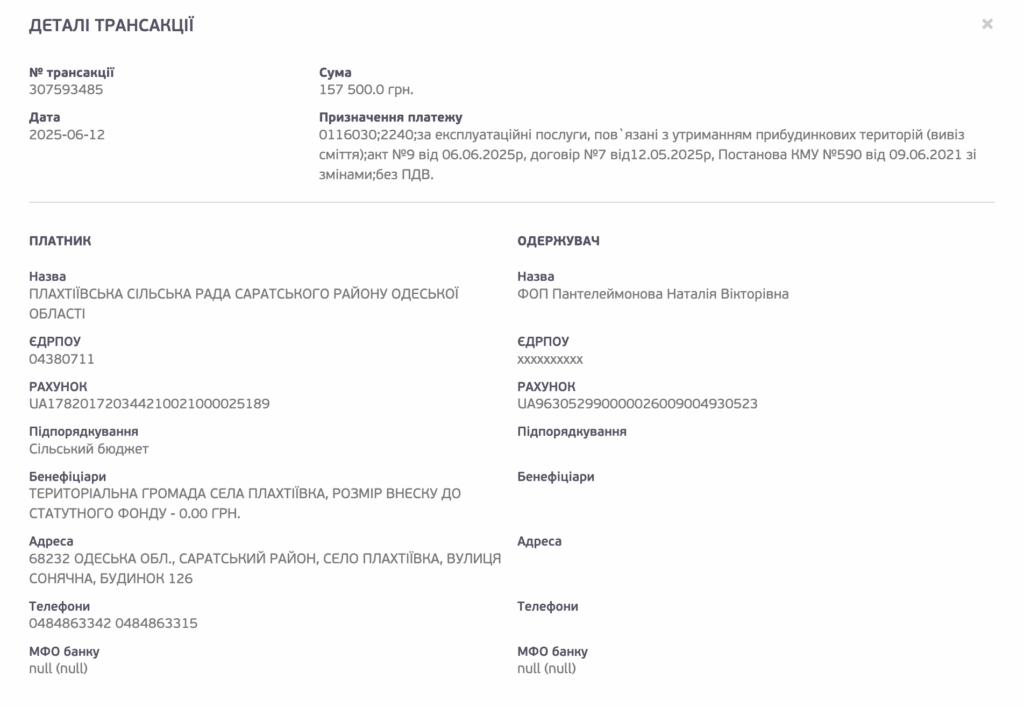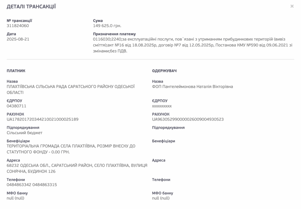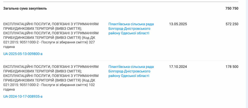 Ще одна закупівля з очікуваною вартістю понад пів мільйона гривень також стосується сміття. А саме, його вивезення. За 572 250 гривень вивозити сміття (також з другої спроби) зголосилася ФОП Наталія Пантелеймонова. Вона отримала підряд у травні і мала виконувати його до кінця 2025 року, та наприкінці вересня припинила свою діяльність.