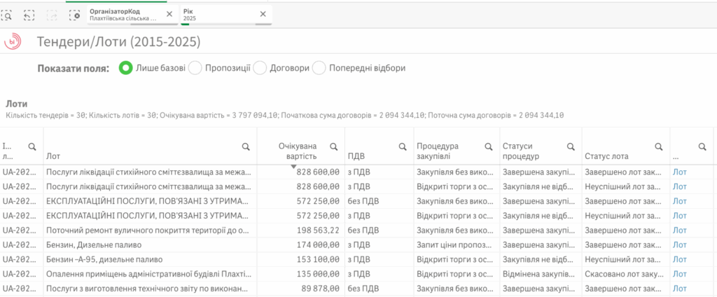 Плахтіївська сільська рада цьогоріч провела 30 закупівель. Поточна сума договорів за ними складає трохи більш як 2 мільйони гривень. Закупівля послуг ліквідації стихійного сміттєзвалища наразі найбільша.