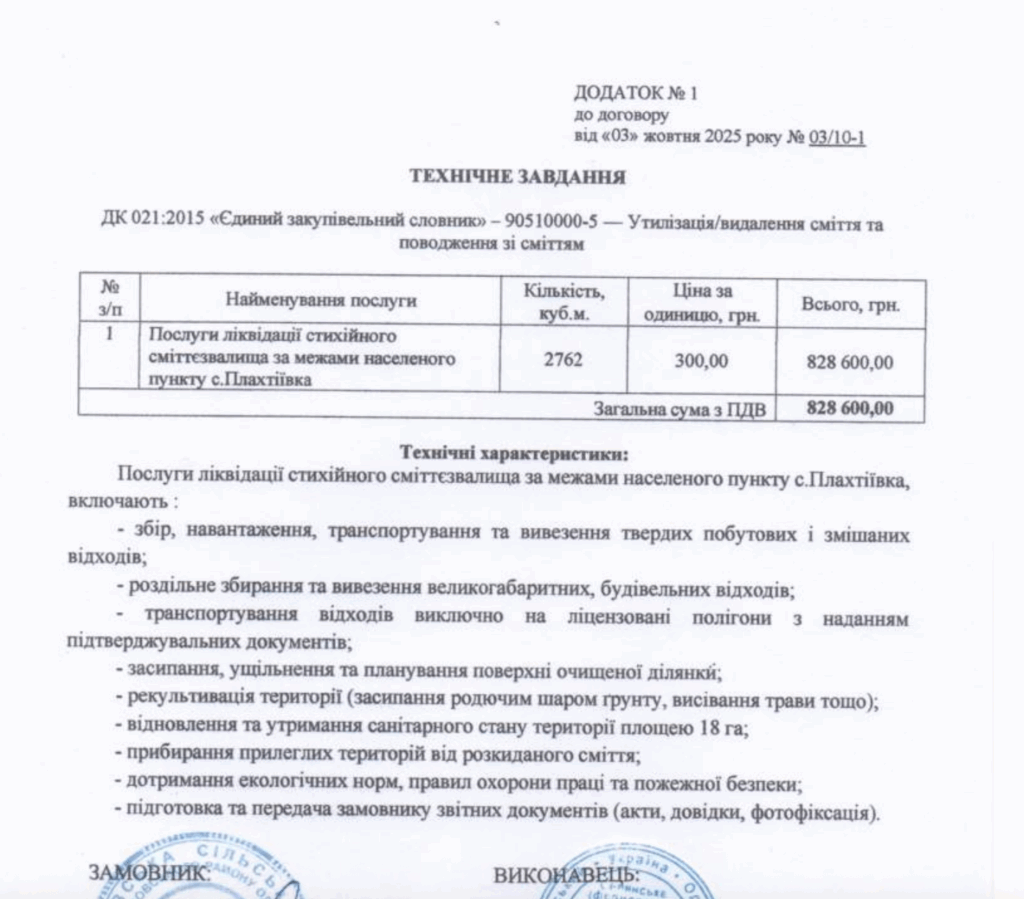 Тобто послуги були надані майже на всю суму договору. Вивозити сміття пані мала з сіл Плахтіївка, Надєжда і Ярославка. Враховуючи, що сільрада оплачувала вивіз сміття лише 3 місяці на рік, не дивно, що біля Плахтіївки утворилося стихійне сміттєзвалище площею 18 гектарів.