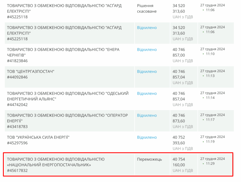 Також в ухвалі згадуються більш вигідні пропозиції на торгах, які були відхилені. Як сказано в тексті ухвали, дешевшу пропозицію було відхилено дискримінаційною ознакою рішенням Замовника, в порушення «Методичних рекомендацій щодо особливостей здійснення публічних закупівель у сфері електроенергетики на період дії правового режиму воєнного стану в Україні» затверджених 07.05.2024 Наказом № 11712.