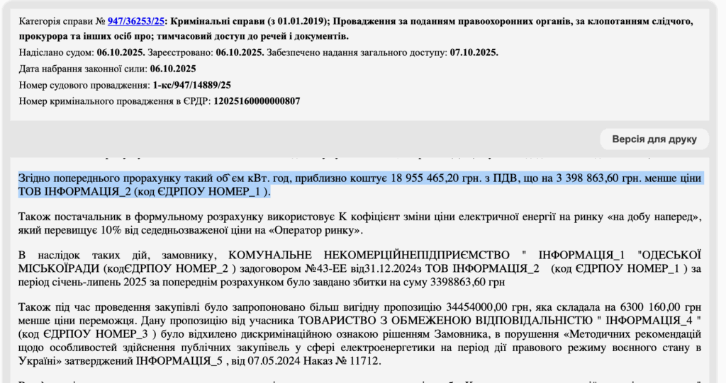 Як йдеться в судовій ухвалі від 6 жовтня 2025 року, з липня поліція розслідує справу щодо розтрати бюджетних коштів під час проведення державних закупівель з постачання електричної енергії. В ухвалі прихована інформація про організатора закупівлі та постачальника, але вказана дата та номер договору і сума закупівлі. Тож закупівлю на порталі Прозорро досить просто ідентифікувати. Мова про придбання електроенергії КНП «Міська клінічна лікарня №10» Одеської міської ради у ТОВ «Національний енергопостачальник».