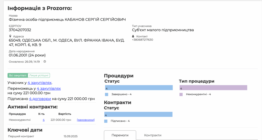 Постачальник у цій закупівлі ТОВ «БЕЙМІЛ АКТИВ». За даними аналітичної платформи YouControl, фірма зареєструвалася 16 вересня 2022 року. Її директор та власник Сергій Кабанов з Одеси.