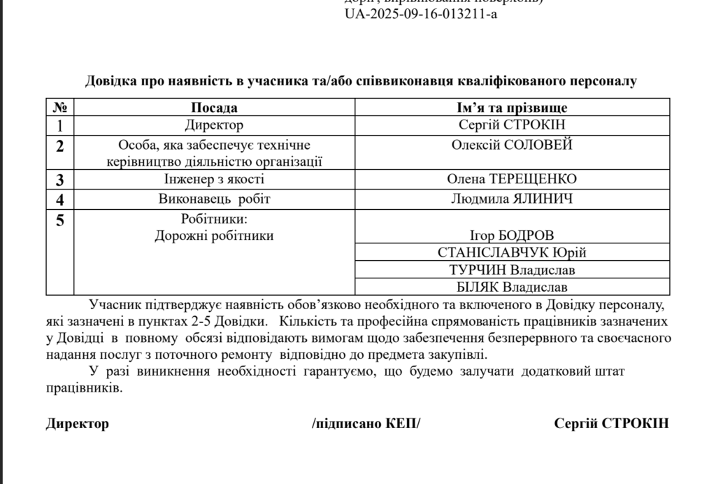 На цю невдалу закупівлю ТОВ «РОУДБУДПІВДЕНЬ» не подавав ніяких відомостей про наявність досвіду. Але подавав документи про працівників та матеріально-технічну базу. Оскільки між двома торгами пройшло менш як місяць, інформація, ймовірно є актуальною. Отже, у цього новоствореного підрядника досить невеликий штат з 5 співробітниками робітничих спеціальностей.