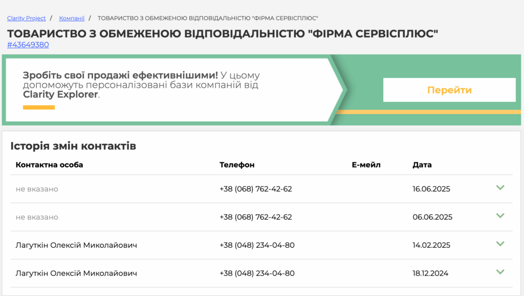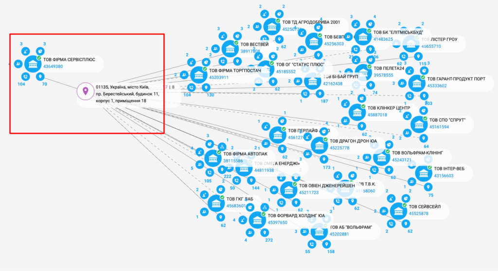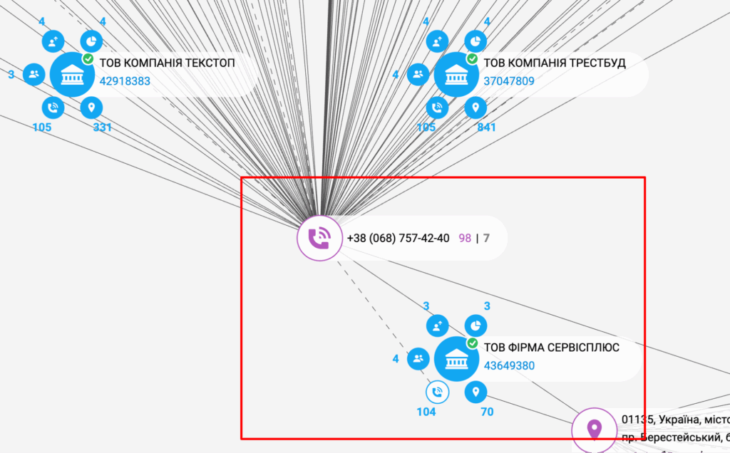 В одному приміщенні з цією фірмою зареєстровано ще 24 юридичні особи. Спільний телефон з ТОВ «Фірма Сервісплюс» має ще 104 компанії.