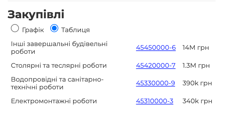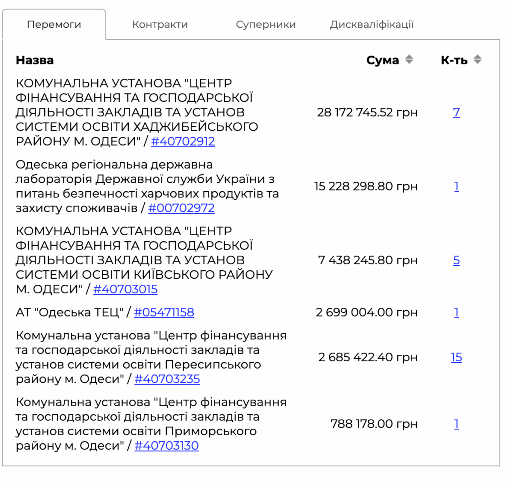 З однією фірмою підписали 19 договорів і всі без конкурсної процедури. З іншою 30 договорів і тільки 6 з них проводилися в форматі відкритих торгів з особливостями. Та на 4 з них більше ніхто не прийшов. І трьома з них цікавилася Держаудитслужба, змушуючи замовника усувати виявлені під час моніторингу порушення.