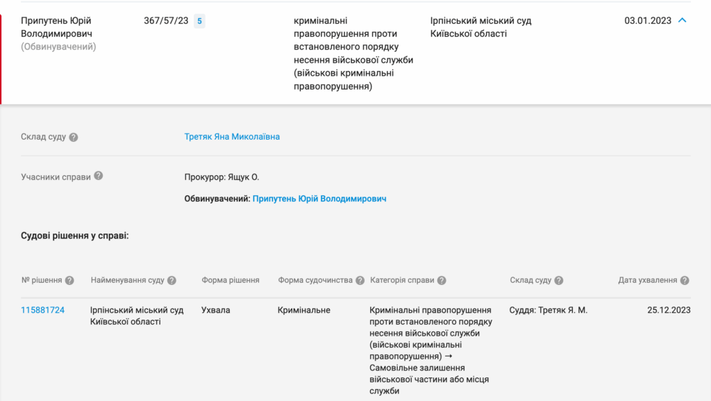 Наразі він є обвинувачуваним у справі, але не корупційній, а про СЗЧ. За даними ухвали, провадження щодо залишення частини відкрили ще у 2022 році. Наразі обвинувачуваний переховується від слідства. Його оголосили у розшук у жовтні 2024 року.