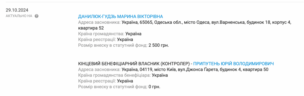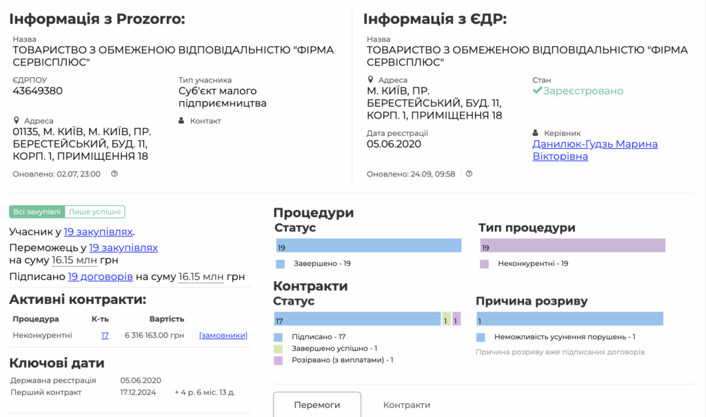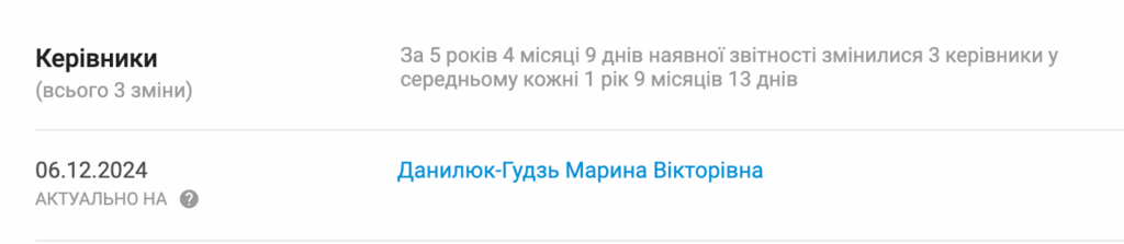 Пані Данилюк-Гудзь стала директоркою і власницею ТОВ «Фірма Сервісплюс» на початку грудня 2024 року.