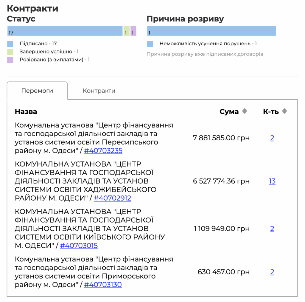 Менш ніж за два тижні після того, як у фірми зʼявилася нова власниця, за даними платформи clarity-project, був підписаний перший контракт за кошти одеської громади. Всі угоди укладені за неконкурентною процедурою. Тобто не опубліковано жодного документа про досвід підрядника, наявність працівників та матеріально-технічної бази.