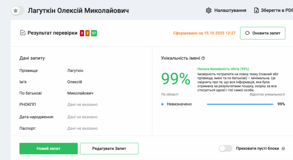 Аналітична платформа YouControl не має даних щодо наявності у Олексія Миколайовича Лагуткіна повних тезок. «Унікальність імені» вказана як 99 відсотків. Та все ж, звісно, існує вірогідність, що маляр фірми ТОВ «Інтегрітіс Флай», контактна особа ТОВ «Фірма Сервісплюс» і особа, яка вже неодноразово привертала увагу правоохоронців та журналістів, це три різні людини.