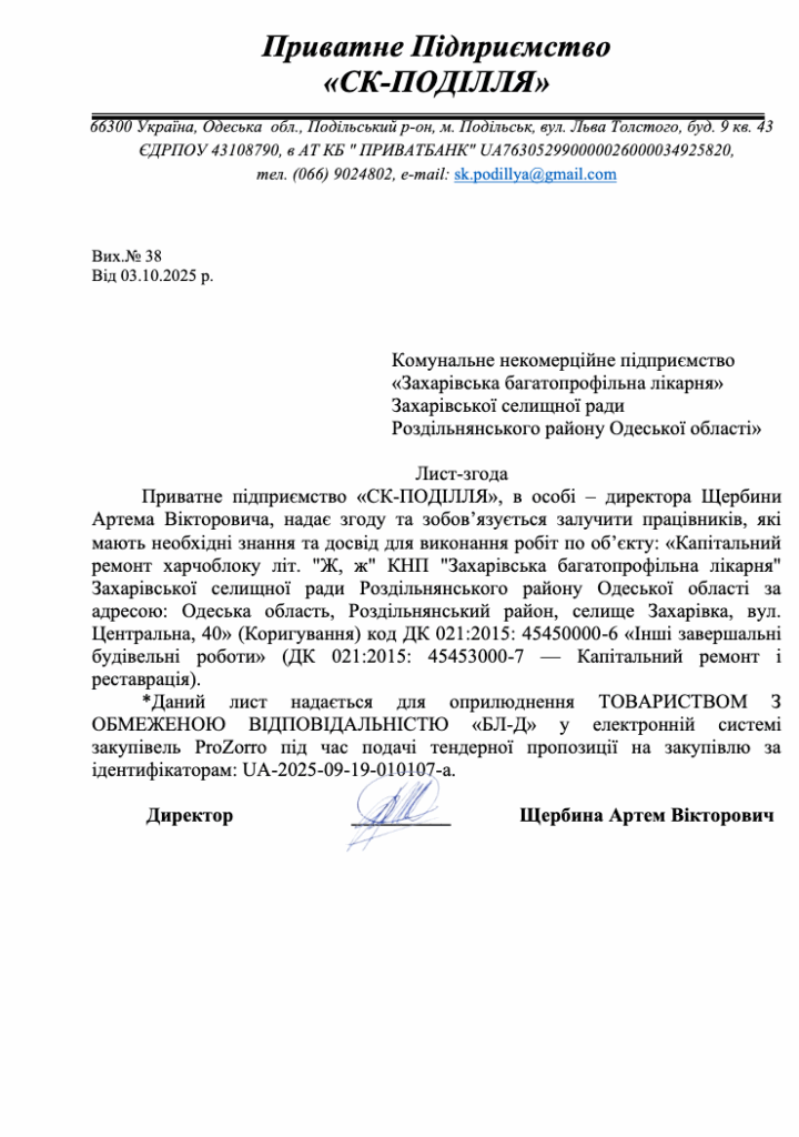Ще один лист-згода, поданий у складі тендерної пропозиції, свідчить, що ТОВ «БЛ-Д» планує залучити до виконання робіт приватне підприємство «СК-Поділля». У документі зазначено, що директор ПП «СК-Поділля» Артем Щербина підтверджує готовність надати своїх працівників, які мають необхідні знання та досвід для виконання будівельних робіт за цим проєктом.