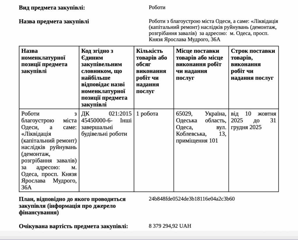 Департамент благоустрою міста Одеської міської ради без використання електронної системи уклав угоду з ліквідації наслідків руйнувань на просп. Князя Ярослава Мудрого, 36А. Йдеться про демонтаж та розгрібання завалів на місці дитячого садка №283, пошкодженого російським дроном в ніч з 18 на 19 лютого 2025 року. Тоді ж була понівечена дитяча поліклініка №6. Роботи з демонтажу будівлі дитсадка обійдуться бюджету міста майже 8,38 млн грн. Завершити їх мають всього лише за 82 дні – до 31 грудня 2025 року.