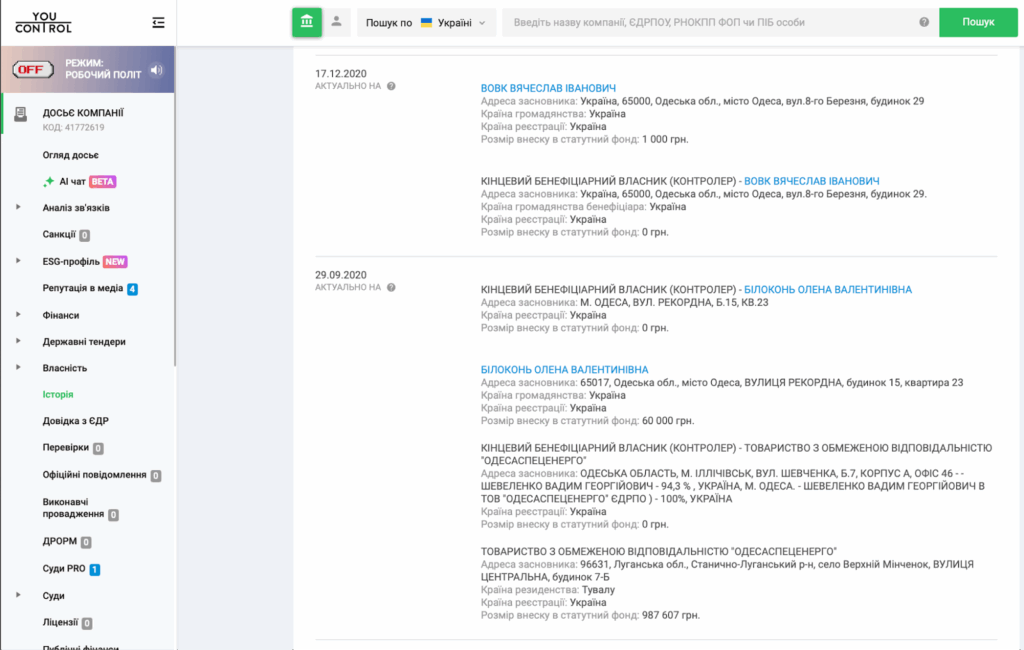 До Вячеслава Вовка фірмою володіла компанія ТОВ «Одесаспеценерго». Остання відома, зокрема завдяки своєму співвласнику та директору Вадиму Шевеленко, який під час відвідування ветеринарної клініки образив лікаря-ветерана ЗСУ Олексія Притулу.