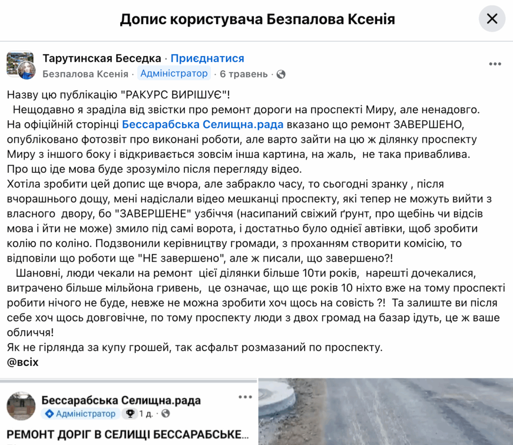 Однак згодом у місцевій групі «Тарутинская беседка» з’явився допис від місцевої мешканки під назвою «Ракурс вирішує». Жінка показала на фото й відео іншу сторону тієї ж ділянки дороги, де, за її словами, узбіччя залишили просто засипаним ґрунтом. Після дощу, зазначила жінка, «насип змило під самі ворота», і мешканці не могли вийти зі своїх дворів.