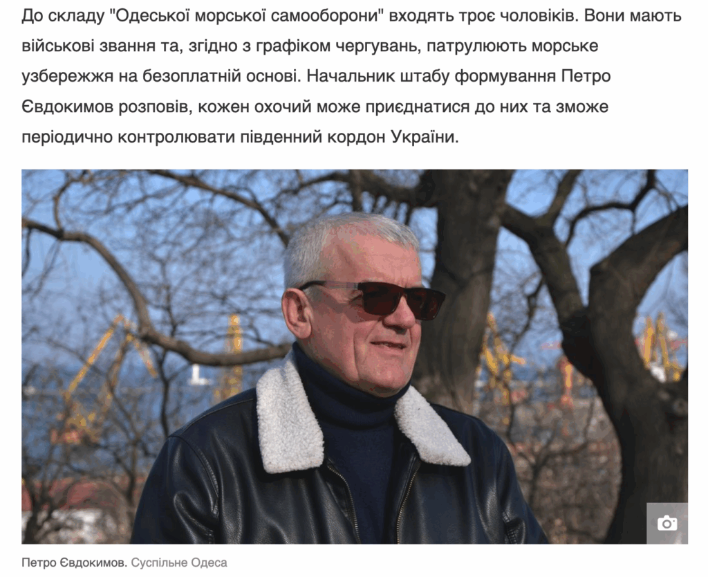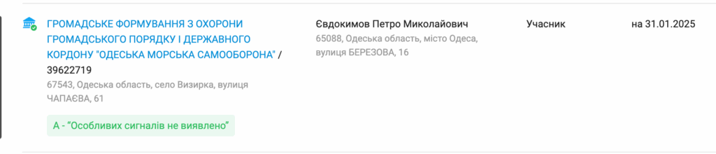 Людина з такими даними (ПІБ) як поточний керівник ГО «Європейська бізнес асоціація» є учасником громадського формування з охорони громадського порядку і державного кордону «Одеська морська самооборона».