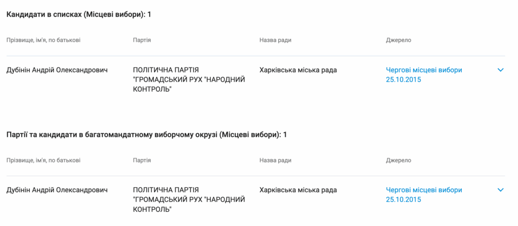 Людина з такими самими ПІБ в Харкові у 2015 році балотувалася до міської ради від політичної партії «Громадський рух «Народний контроль»».