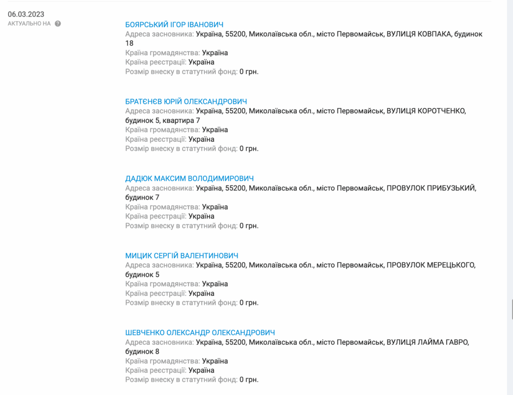 У переліку засновників пʼятеро осіб з міста Первомайськ, що на Миколаївщині. Ігор Боярський, Юрій Братєнєв, Максим Дадюк, Сергій Мацик та Олександр Шевченко.