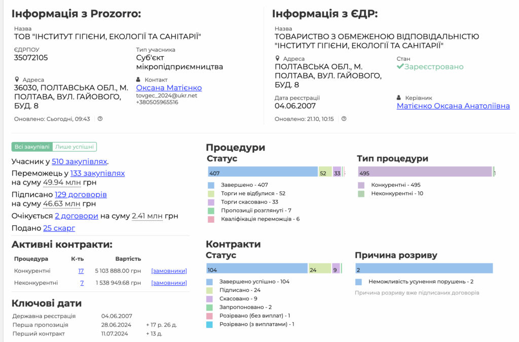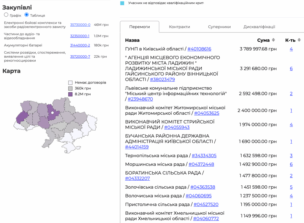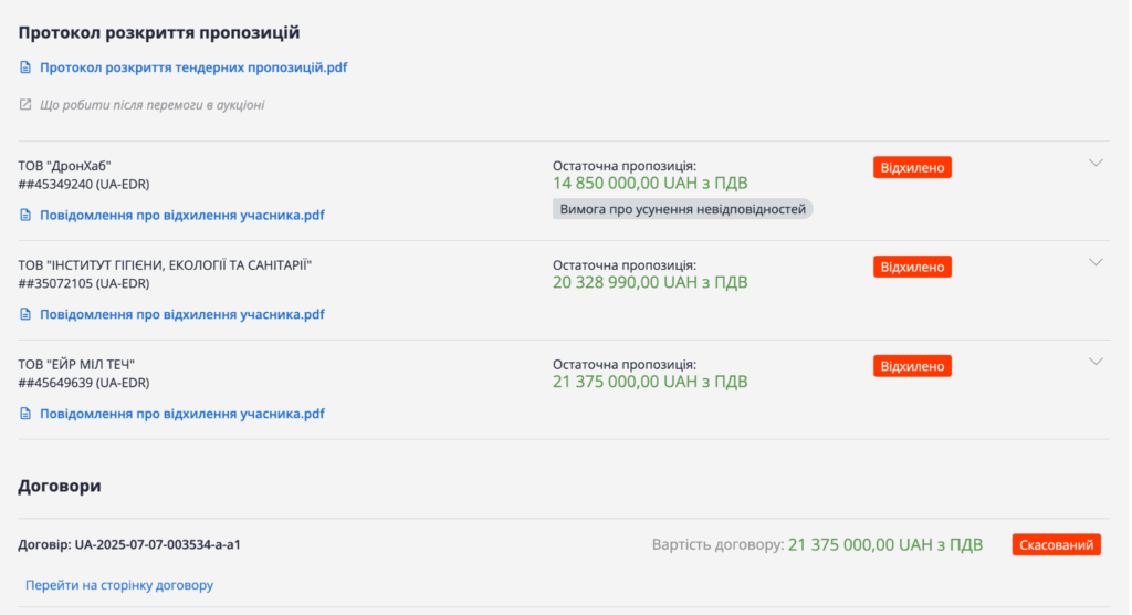 Дві фірми, які подали пропозиції, мали досвід реалізації контрактів за бюджетний кошт. Це ТОВ «ДронХаб» з Одещини та ТОВ «Інститут гігієни, екології та санітарії» з Полтави.