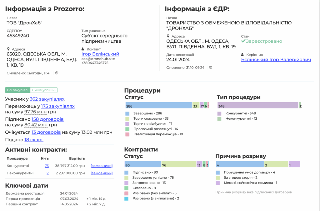 Цікаво, що «ДронХаб» за менш ніж два роки існування вже отримав контракти від чиновників на  понад 80 мільйонів гривень. Але переважно за конкурентною процедурою закупівель.