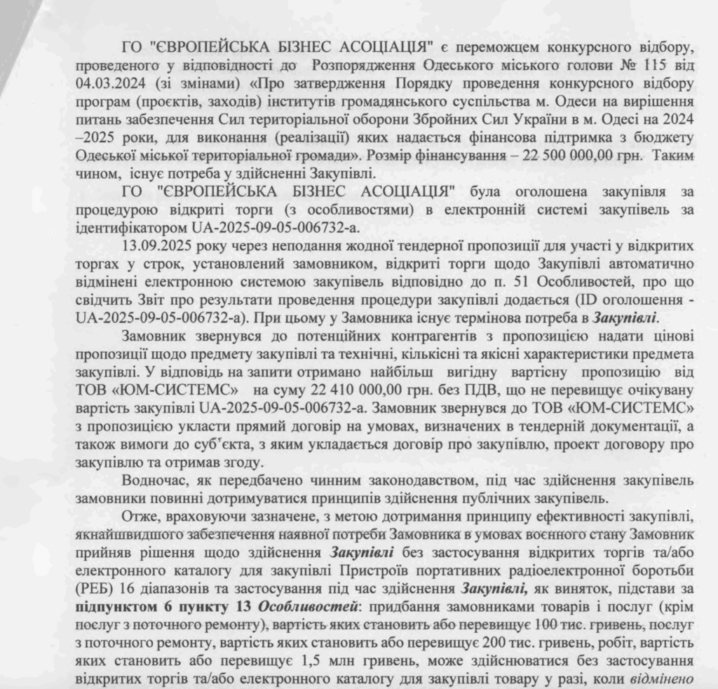 Закупати портативні пристрої радіоелектронної боротьби (РЕБ) 16 діапазонів доручили ГО «Європейська бізнес асоціація». В обгрунтуванні закупівлі міститься інформація про те, що це ГО є переможцем конкурсного відбору програм інститутів громадянського суспільства м. Одеси на вирішення питань забезпечення Сил територіальної оборони Збройних Сил України в м. Одесі на 2024 –2025 роки. Конкурс провели за розпорядженням Геннадія Труханова №115 від 04.03.2024