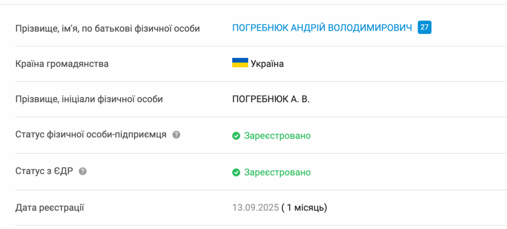 За даними аналітичної платформи YouControl, ФОП Погребнюк Андрій Володимирович зареєструвався 13 вересня.