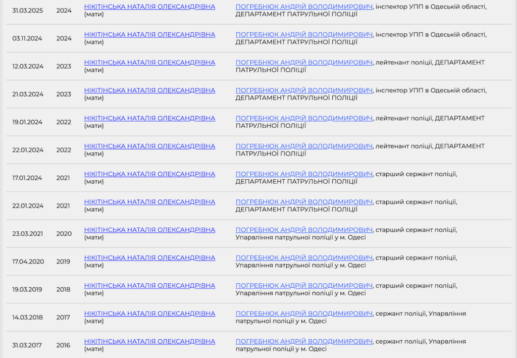 Цікаво, що в селищі Великодолинське інспектором патрульної поліції до листопада 2024 року працював чоловік з такими самими ПІБ. Декларації, як поліцейський він подавав з 2016 року.