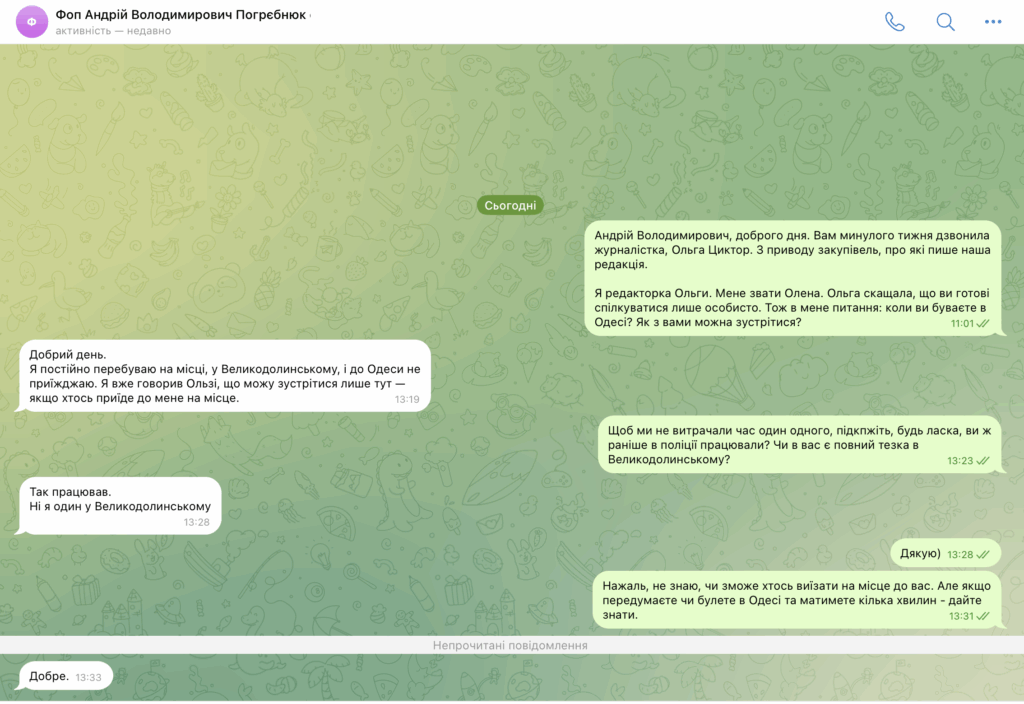 Підприємець підтвердив редакції, що це він працював раніше в поліції, однак відповідати на будь-які питання погодився лише в тому випадку, якщо журналісти приїдуть до нього в село особисто.