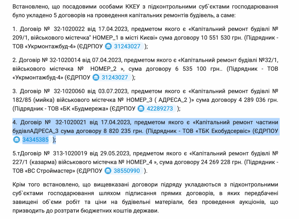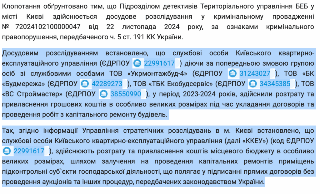 Водночас згідно з текстом ухвали Голосіївського районного суду міста Київ від 30 червня 2025 року, діяльністю фірми-підрядника цікавляться правоохоронці. Як йдеться в ухвалі, згідно з інформацією Управління стратегічних розслідувань в м. Києві, службові особи Київського квартирно-експлуатаційного управління, здійснюють розтрату та привласнення коштів місцевого бюджету в особливо великих розмірах. Роблять вони це шляхом залучення на проведення капітальних ремонтів приміщень підконтрольні суб`єкти господарської діяльності, що полягає у підписанні прямих договорів без проведення аукціонів.