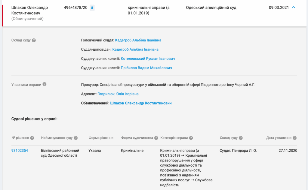 За даними, що містяться у вироку, мова в справі йшла про здійснення технічного нагляду під час виконання ТОВ «Перший Квартал» робіт на будівництві будівлі їдальні у військовому містечку. На той час Олександр Шпаков обіймав посаду інженера з технічного нагляду та був службовою особою уповноваженою Південним ТерКЕУ. Свою провину чоловік визнав та заявив про щире каяття.