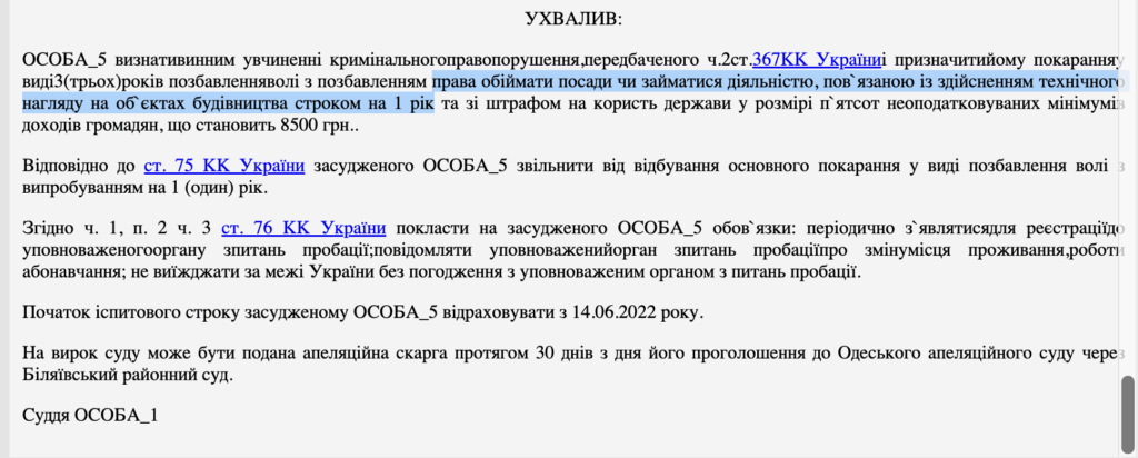 Чоловіка засудили до трьох років позбавлення волі, але звільнили від покарання з іспитовим строком на 1 рік. Цікаво, що тим самим вироком суд заборонив Олександру Шпакову обіймати посади чи займатися діяльністю, пов`язаною із здійсненням технічного нагляду на об`єктах будівництва строком на 1 рік. Як тільки рік сплив, чоловік продовжив свою діяльність за бюджетні кошти.