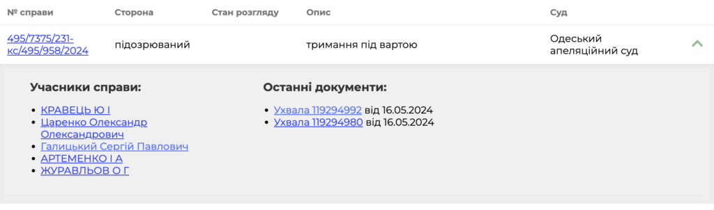 Судячи з судової ухвали й даних Clarity, у цій справі Сергій Г. як підозрюваний навіть перебував під вартою.