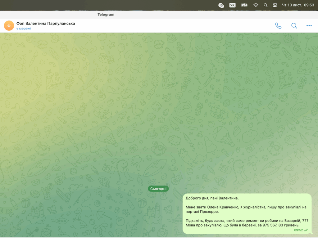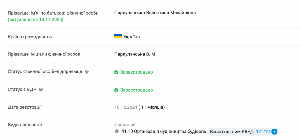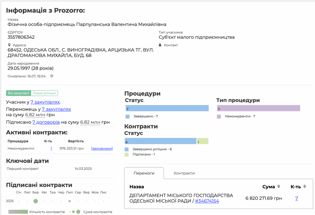 Договір підписали з фізичною особою підприємцем Валентиною Парпуланською. Пані Валентина зареєструвалася як ФОП менше року тому, у грудні 2024 року. Тобто, коли з нею підписували договір, вона займалася бізнесом три місяці.