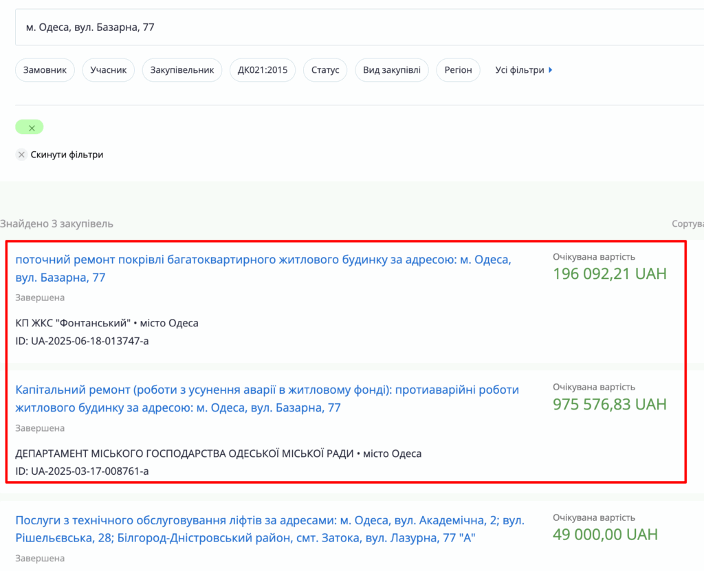 Дізнавшись від мешканців про «ремонт за мільйон», журналісти пошукали його на порталі Прозорро. За адресою Базарна, 77 знайшли тільки одну схожу закупівлю. Це «Капітальний ремонт (роботи з усунення аварії в житловому фонді): протиаварійні роботи житлового будинку за адресою: м. Одеса, вул. Базарна, 77», замовлений у березні поточного року Департаментом міського господарства Одеської міської ради.