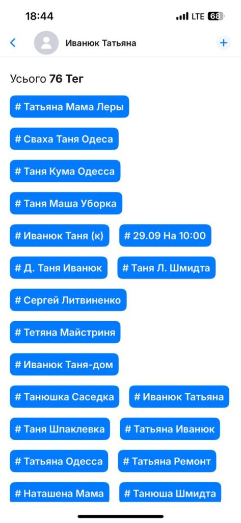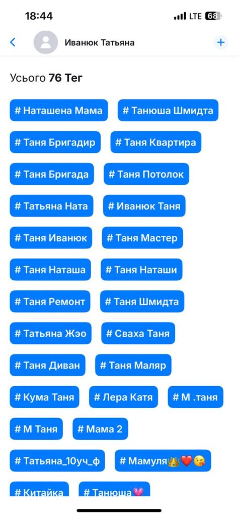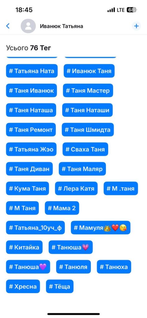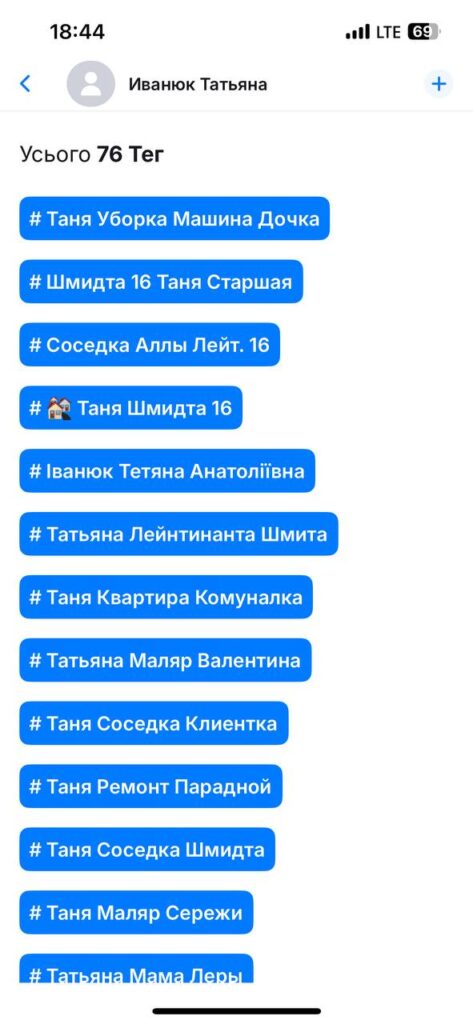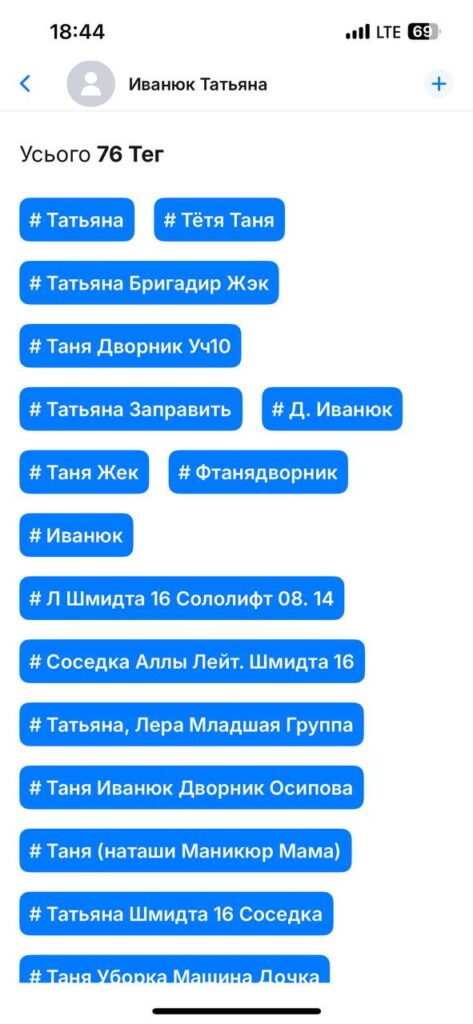 За номером телефону додаток Гетконтакт «підтягає» такі записи, як «Татьяна Бригадир Жек», «Таня Дворник Уч10», «Таня Жек», «Таня Иванюк Дворник Осипова», «Таня Шмидта 16», «Таня10уч_ф», «Шмидта 16 Таня Старшая».