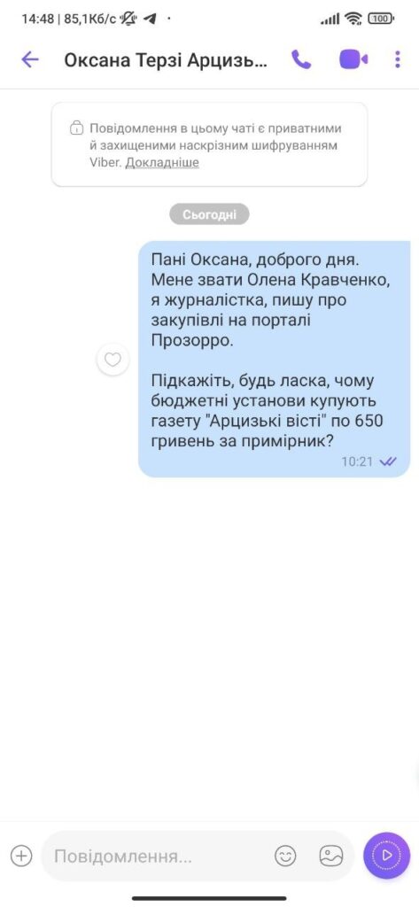 Журналістка «Антикорупційного виміру» написала повідомлення на номер, вказаний Оксаною Терзі, як контактний, і запитала, чому бюджетні установи купують примірник газети по 650 гривень. Жінка повідомлення прочитала, але ніяк на нього не відреагувала.