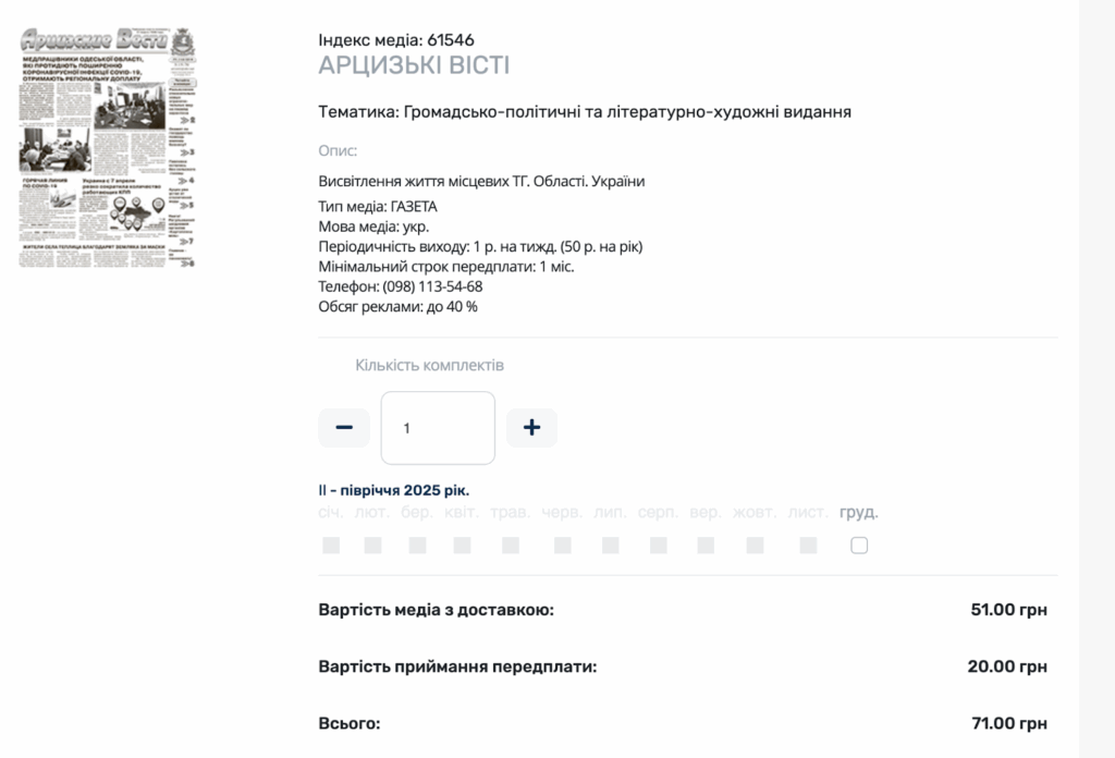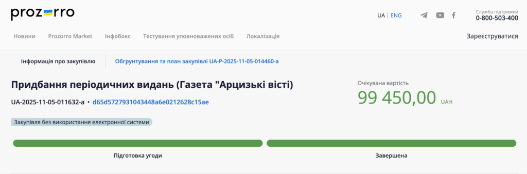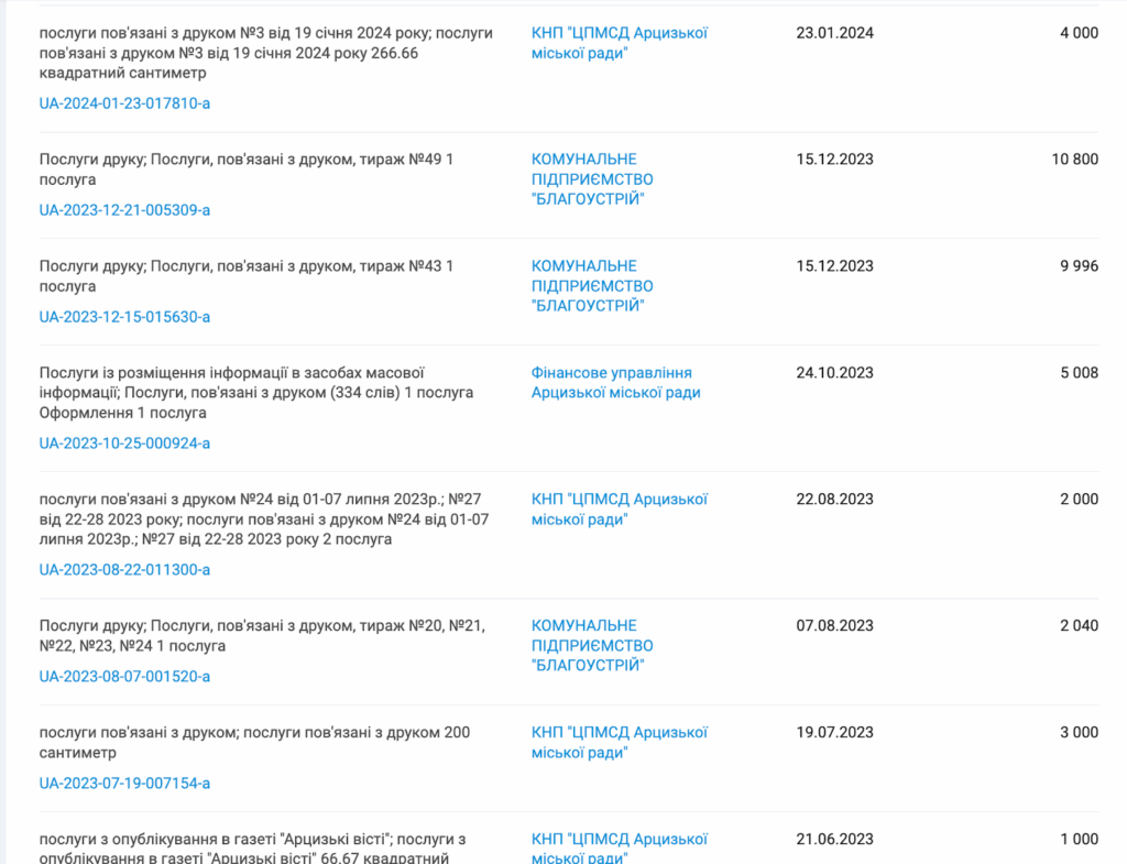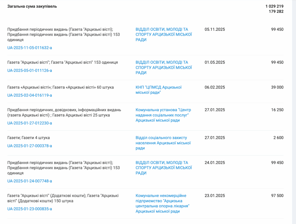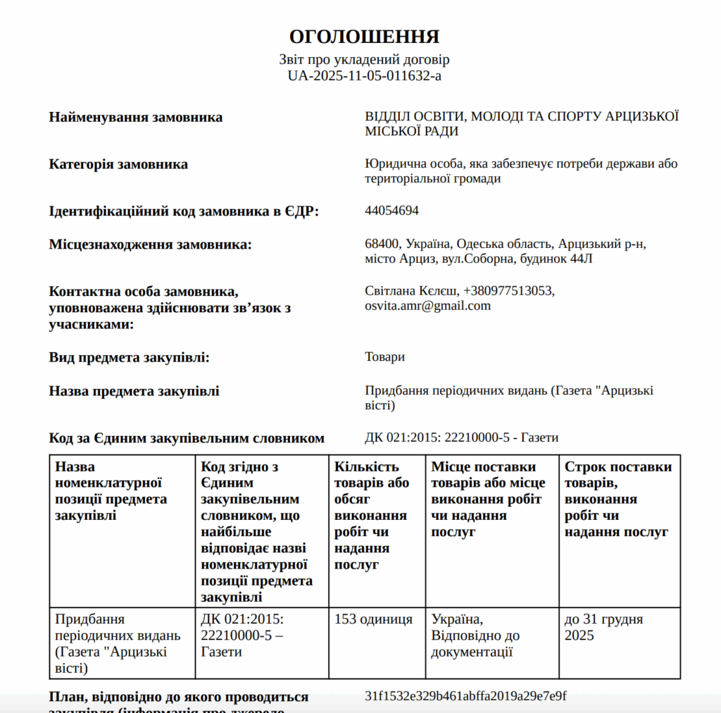 Відділ освіти, молоді та спорту Арцизької міської ради замовив газети «Арцизькі вісті» на майже сто тисяч гривень. Відзвітувавши про закупівлю на Прозорро, чиновники не опублікували сам договір. Однак в специфікації сказано, що 153 одиниці продукції. Тобто по 650 гривень за одиницю. Цікавий попит серед бюджетних установ на газету виник лише у 2025 році, коли у ТОВ, що видає «Арцизькі вісті» змінилася керівниця і власниця.