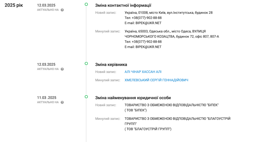 Цікаво, що підрядник ТОВ «Благоустрій Групп» з початку 2022 року не бере участь у публічних закупівлях, проте цьогоріч у фірмі стались значні зміни. У 2025 році підприємство пережило повне переформатування структури власності, керівництва та навіть виду діяльності. У березні в реєстрі з’явилися записи про передачу компанії новій засновниці, громадянці Іраку Чінар Хасан А., яка стала і єдиним кінцевим бенефіціарним власником. Паралельно змінили керівника, й замість Івана М. посаду отримав спочатку Сергій Х., а згодом сама Чінар Хассан А. Компанія також вийшла з будівельної сфери, змінивши основний КВЕД на «неспеціалізовану оптову торгівлю», а її контактні адреси кілька разів оновлювали з Одеської області на Київську.