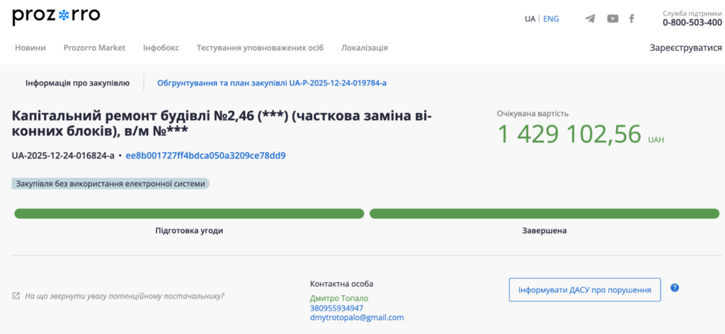 Менш зрозумілим видається вибір підрядника. Ним став ФОП Стецин Віталій Володимирович. За даними аналітичної платформи YouControl, свою діяльність підприємець розпочав 30 липня 2025 року. Тобто на момент укладання договору досвіду в нього було 4 місяці. Всього за 4 місяці роботи ФОП отримав три підряди за бюджетний кошт. Всі без конкуренції.