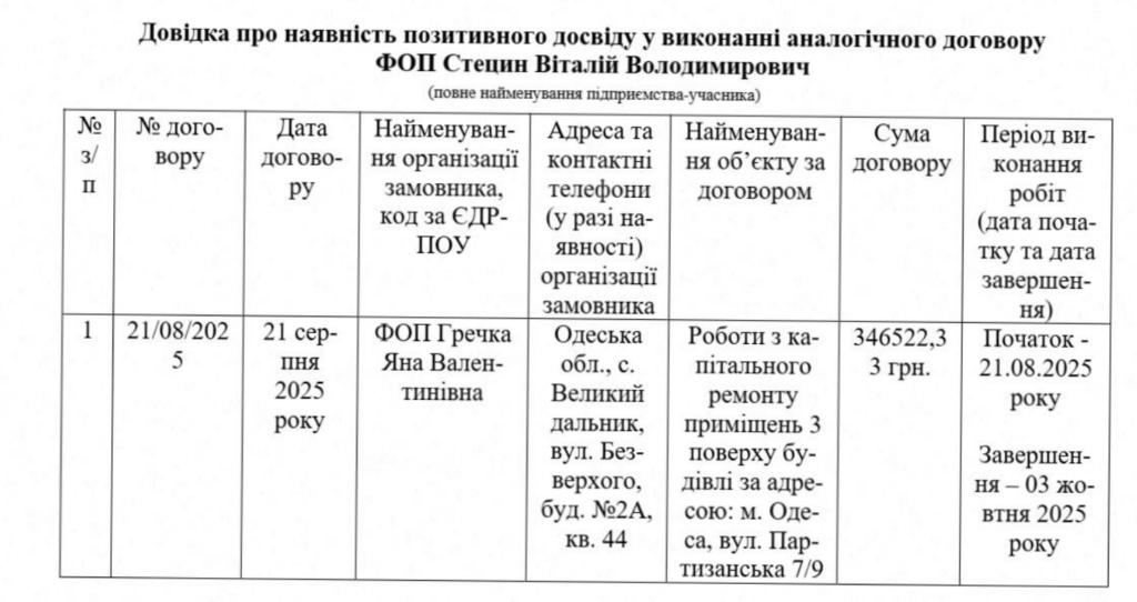 На підтвердження досвіду надав дані, що виконував ремонт для приватної підприємиці, що займається роздрібною торгівлею і сама працює менше року. Проте спромоглася вкласти майже 350 тисяч гривень в ремонт приміщення в будівлі, де площі здаються в оренду.