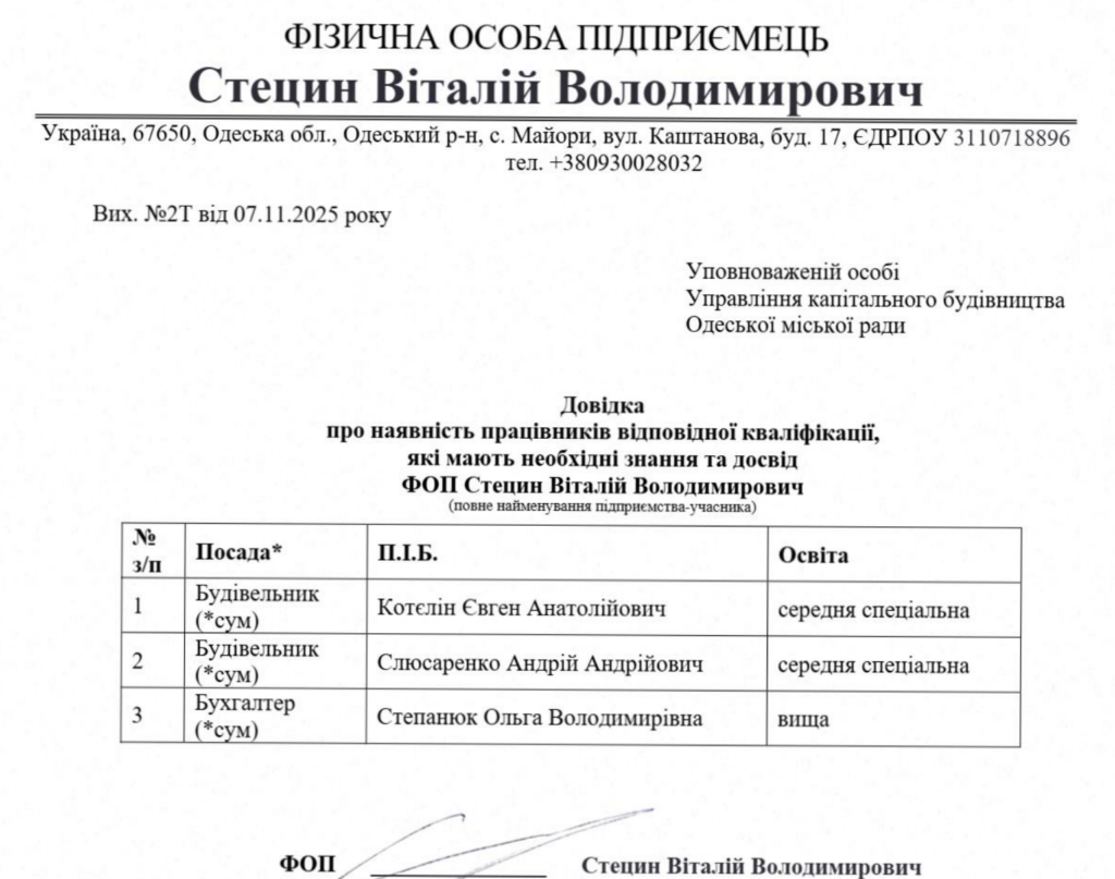 На перші свої торги ФОП Віталій Стецин подав документи, згідно з якими в нього працює два будівельники і бухгалтер.