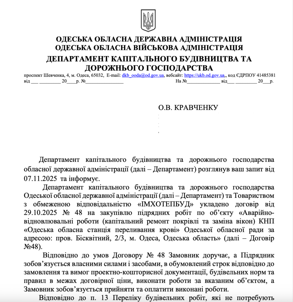 У листопаді редакція «Антикорупційного виміру» розповідала читачам про те, як Департамент капітального будівництва та дорожнього господарства Одеської обласної державної адміністрації віддав без конкурсу підряд на аварійно-відновлювальні роботи в КНП «Одеська обласна станція переливання крові» дуже цікавій фірмі. Крім того, журналісти зʼясували, що роботи за договором, згідно з цим же самим договором, розпочали ще до укладання договору. Щоб розібратися, як таке можливо, редакція подала запит до Департаменту капітального будівництва та дорожнього господарства Одеської обласної державної адміністрації.