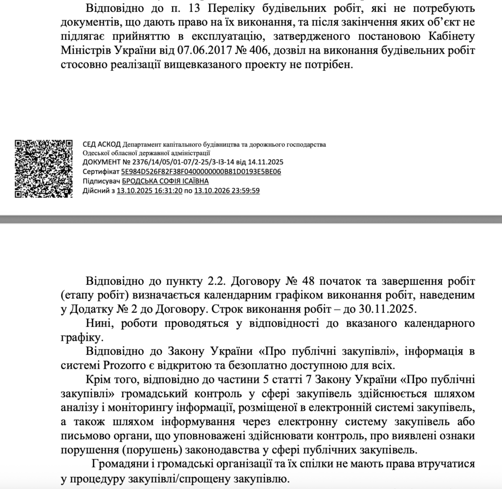 Відповідь отримали, м’яко кажучи, дивну. Так, виконуюча обов’язки директора Департаменту Софія Бродська, у відповідь на запит від фізичної особи (журналістки редакції) заявила, що «громадяни і громадські організації та їх спілки не мають права втручатися у процедуру закупівлі/спрощену закупівлю». А от про те, чи мають чиновники право підписувати договір, за яким роботи розпочалися до підписання договору не відповіла ані слова.