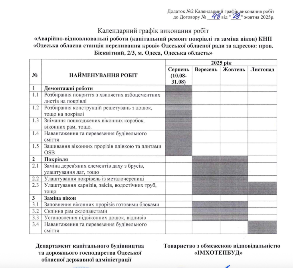 Детально про фірму, якій Департамент капітального будівництва та дорожнього господарства Одеської обласної державної адміністрації чомусь дозволив почати відновлювати станцію переливання крові до укладання договору читайте в статті «Антикорупційного виміру»: