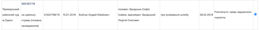 З даних порталу Судова влада України відомо, що у 218 році пані Бродська розлучилася з чоловіком.