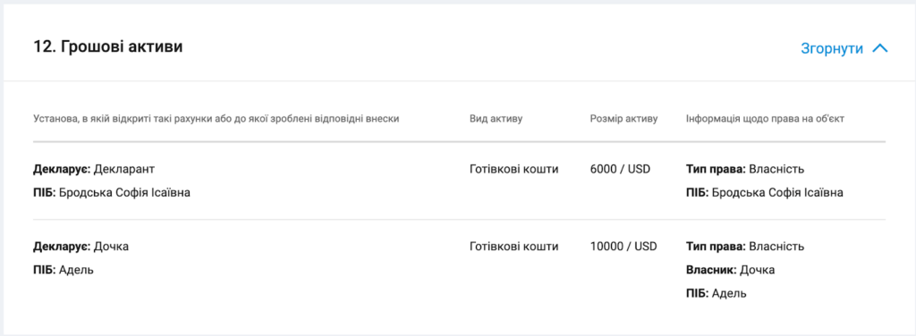 Далі ще цікавіше. Згідно з декларацією за 2023 рік, У Софії Бродської не було нічого, окрім машини, а заробила вона за рік 278 909 гривень. Але ж у декларації за 2024 рік звідкись беруться 16 000 доларів заощаджень на двох з дочкою.