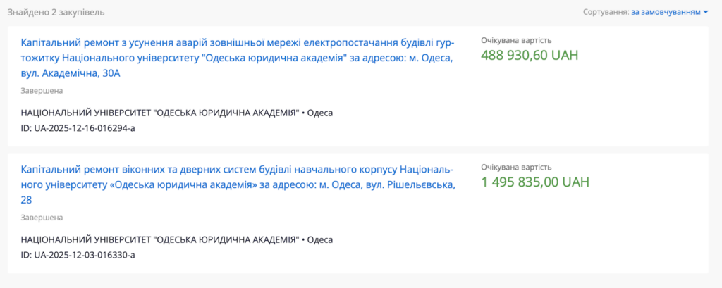 Національний університет «Одеська юридична академія» заплатить майже 1,5 мільйона гривень за ремонт віконних та дверних систем у будівлі навчального корпусу на вул. Рішельєвська, 28. Договір з підрядником уклали 3 грудня. Згодом, 12 грудня, навчальний заклад також замовив  роботи з усунення аварій зовнішньої мережі електропостачання для будівлі гуртожитку №9 за адресою вул. Академічна, 30А за понад 488 тис. грн.
