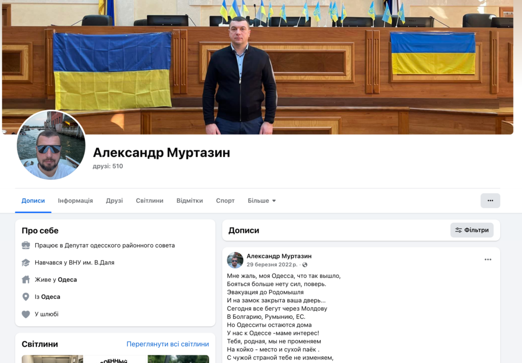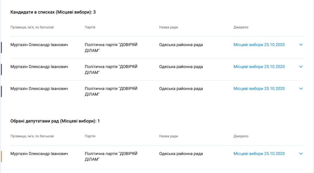 У 2020 році до Одеської районної ради обрали депутатом від партії «Довіряй ділам» Олександра Івановича Муртазіна. Про це свідчать дані аналітичної платформи YouControl, та декларації, які сумлінно подавав депутат.