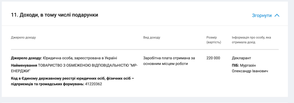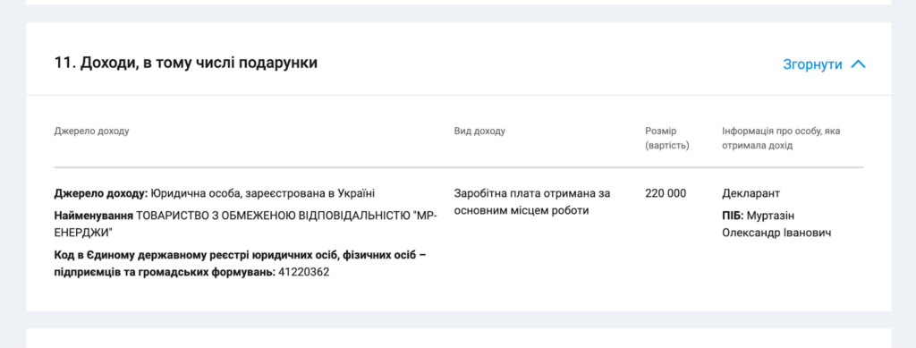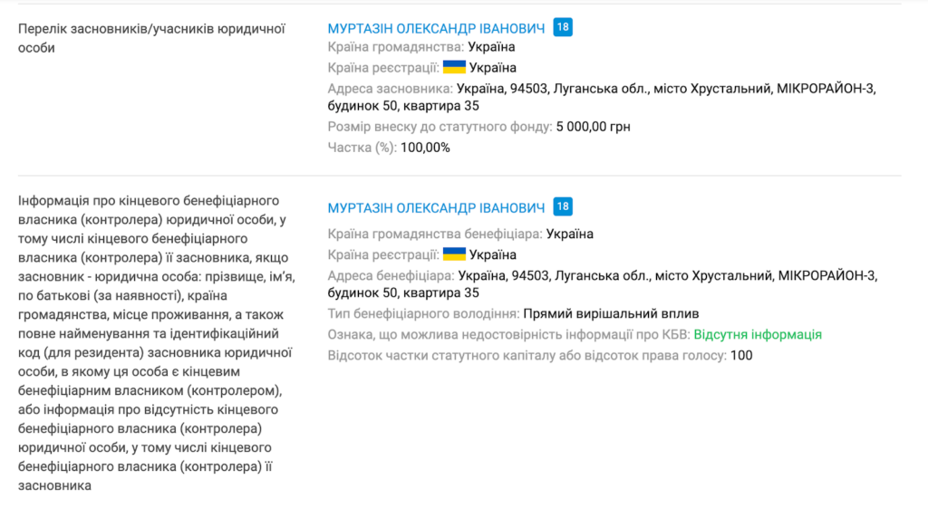 Фірма, власником і керівником якої є Олександр Муртазін займається посередництвом у торгівлі паливом, рудами, металами та промисловими хімічними речовинами. Про паливо і хімічні елементи варто запамʼятати. Депутат не декларує ніяких доходів від роботи цієї компанії, а з відкритих джерел не відомо, чи фірма веде якусь діяльність.