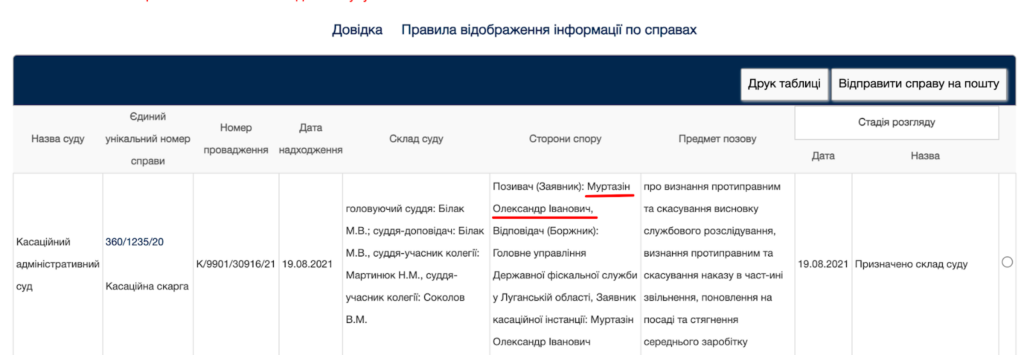 На Луганщині Олександр Муртазін працював у податковій міліції. Саме таке формулювання вказане в судовій ухвалі. За даними ухвали Олександр Муртазін намагався поновитися на посаді старшого оперуповноваженого відділу протидії несплаті податків суб`єктами ЗЕД оперативного управління Головного управління ДФС у Луганській області.
